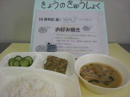 今日のメニューは「お好み焼き(年1回、卵除去食も調理)、豚汁、きゅうりの酢のもの、ごはん、牛乳」でした。
