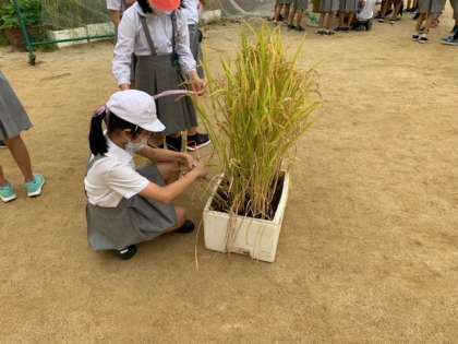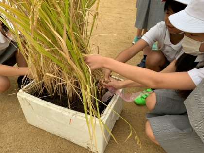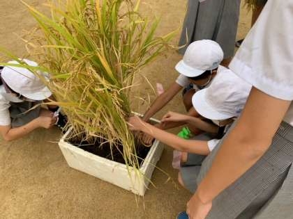 ハサミを使って、根本から稲をカットし、スズランテープでさっと結び、柵に干しました。役割分担をして手際よく作業していました。
