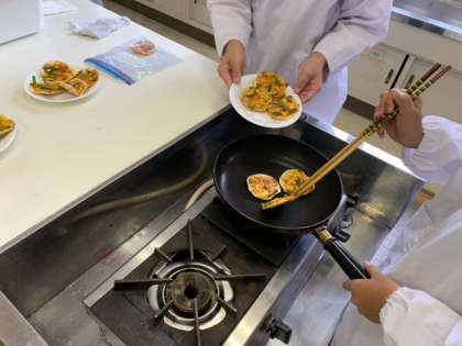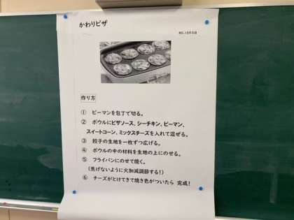 家庭科クラブはみんなで「かわりピザ」を作りました。家庭科室の中にいい匂いが広がっていて、とても美味しそうなピザができました。