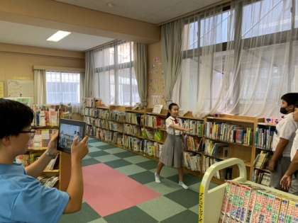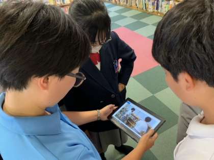 図書委員会は、委員会発表に向けてビデオ撮影をしていました。撮影した動画をその場でチェックして、見直したり、修正したりして、工夫しながら活動していました。