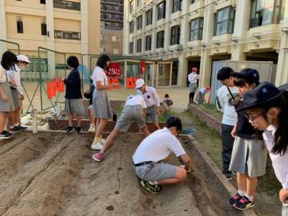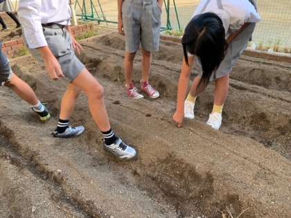 飼育園芸委員会は、学習園に冬野菜を植えていました。スコップで耕したり、畝を作ったりして、そこに野菜の種をまきました。成長が楽しみです。