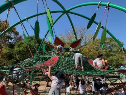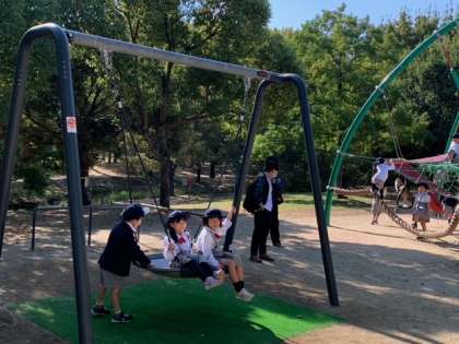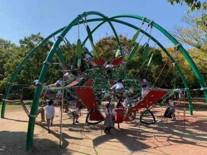遊具遊びでは、大きなアスレチック型の遊具や大きなシーソー型の遊具で遊びました。みんな歓声を上げながら元気に遊びました。