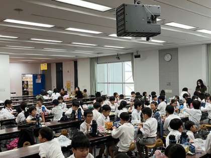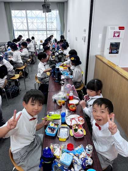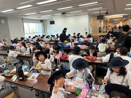館内でお弁当を食べました。たくさん遊んだので、お腹もすいてます。みんなで食べる弁当はとても美味しいです。