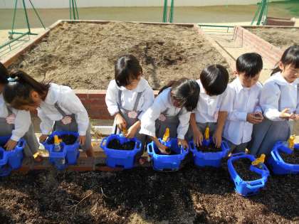 子どもたちは、赤・白・黄・紫・ピンクの5色の中から好きな色の球根を選び、植えています。