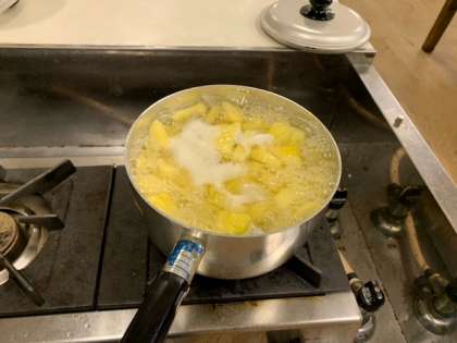 茹でたさつまいもを袋に入れて、手で揉みほぐし、スイートポテトを作りました。