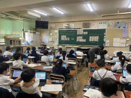 2年生は算数で「かけ算」の学習をしました。同じ数ずつまとめられたときに、どのようにかけ算を使って計算できるかをみんなで考えました。