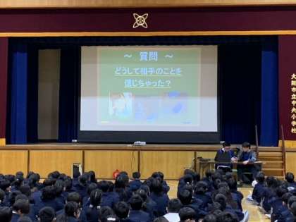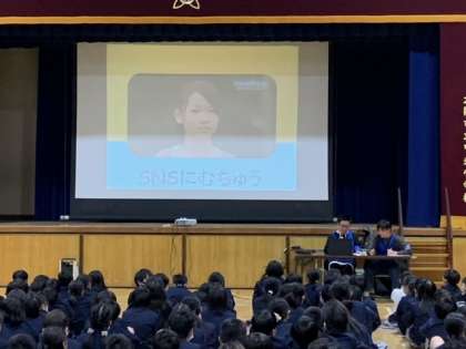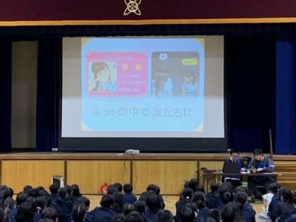 5・6年生は警察の方に来ていただき、インターネットやSNSの安全な使い方について学習しました。便利な反面、危険もあるスマホについて、安全に使っていくためにはどんなことが大事かをみんなで考えました。