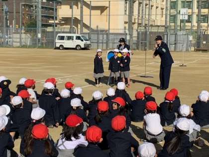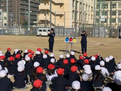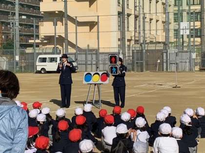 グラウンドに模擬の信号機や横断歩道を設置し、安全な歩き方や信号機の確かめ方など丁寧に教えてもらいました。