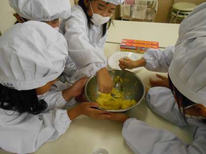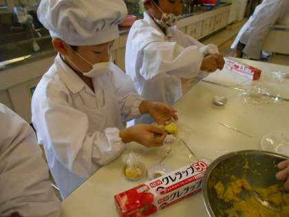 学習園でとれたおいもで、スィートポテトを作ったよ。ゆでたおいもに、バターとおさとうを入れてまぜまぜまぜ。いいにおいがしてきたよ。ラップで包んで、きらきらモールでまいて、おしゃれにかざったよ。