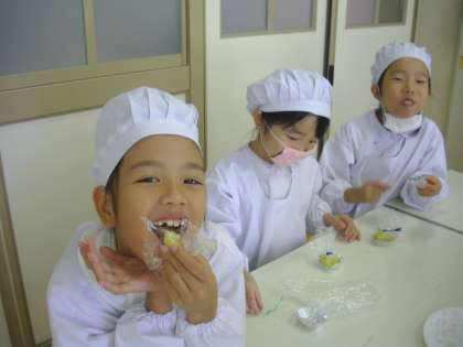 「いただきまあす。」「おいしいね。」みんなにこにこ。1年生にもプレゼントしたよ。1年生もにこにこにこ。よろこんでもらって、うれしいな。
