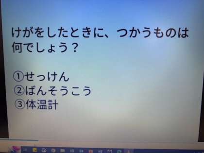 手洗いの仕方や怪我をしたときの対処の仕方などをクイズを通して紹介しました。