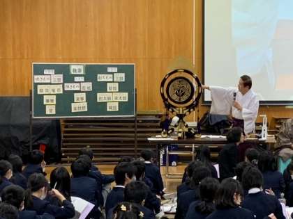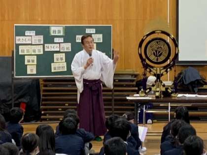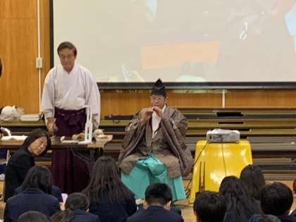 6年生はゲストティチャーを招いて雅楽鑑賞を行いました。高津宮の方達が来てくださり、日本の伝統的な音楽である雅楽について学びました。