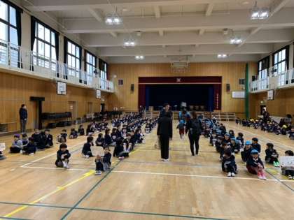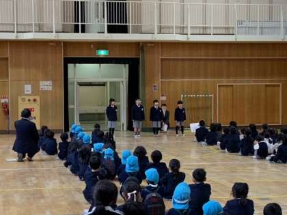 1年生は幼稚園や保育園の子たちと交流会をしました。1年生になってできるようになったことや昔遊びを披露しました。校舎の中も一緒に回って、「小学校はこんなところだよ」と紹介しました。優しく教える1年生の姿に、この1年間での成長を感じました。