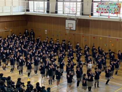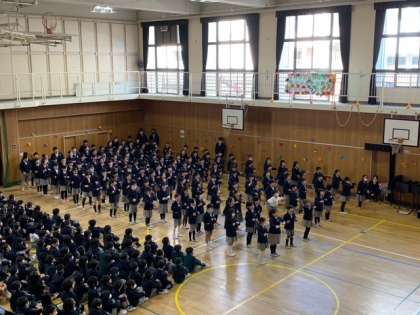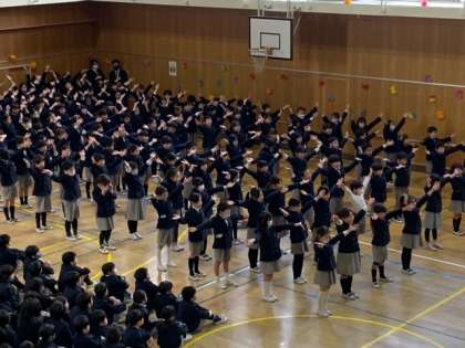 3年生は、6年生に魔法をかけて、立派な中学生に変身させていました。魔法の言葉は「もえもえキュン」