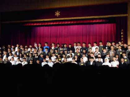 3年生の劇を鑑賞しました。平和に対する強いメッセージと素晴らしい演技に感動し、中学校生活への期待を膨らませました。