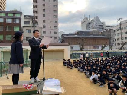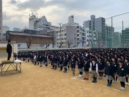 3月はじめの朝会を運動場で行いました。