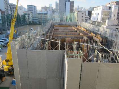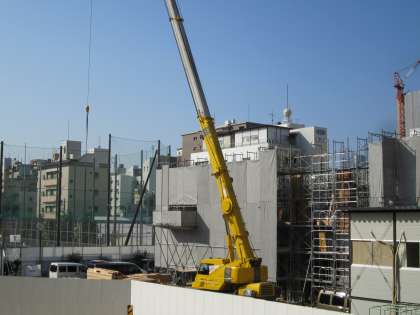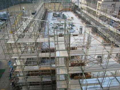 2階の教室を作っています。工事フェンスを越したので幕が張られました。