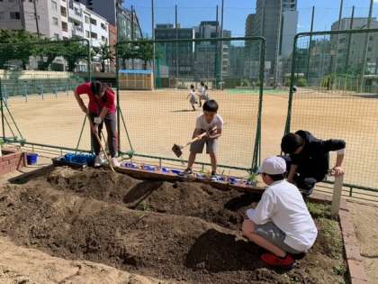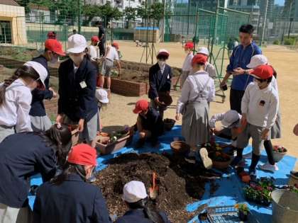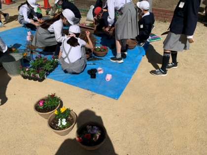飼育園芸委員会さんは、花壇に新しく届いた花を植えていました。学校が華やかになりました。