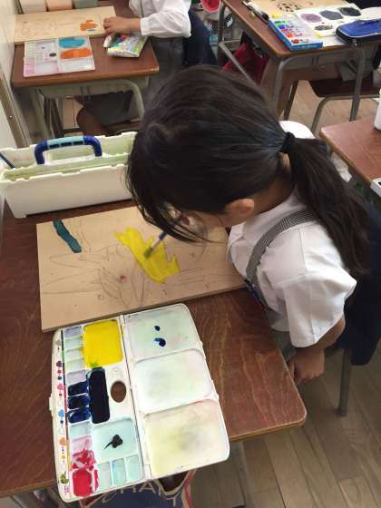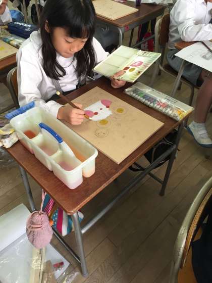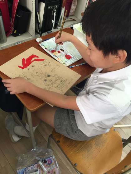 コリントゲームの台の部分の絵を描いています。みんな思い思いの絵を集中して描いています。