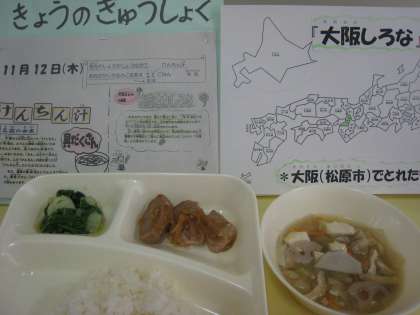 ごはんによく合う和風献立で、今日もニコニコしながら「豚肉がごはんによくあってたヨ!」「大阪しろながとってもおいしかったヨ!」等多くの児童から声が出ていました。