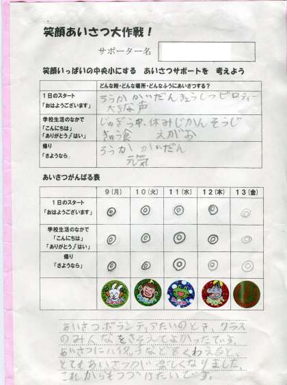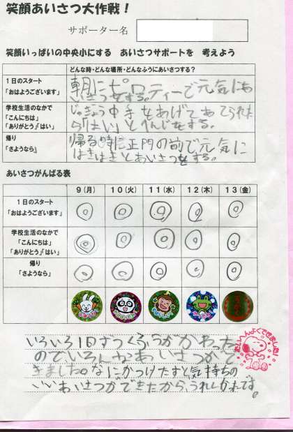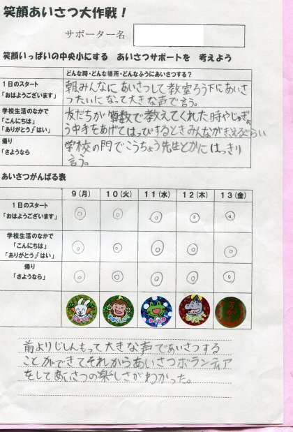 あいさつでみんなを笑顔にしようと、作戦を立てました。