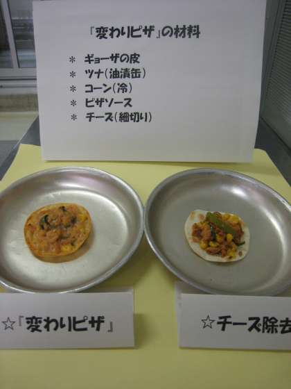 「変わりピザ」はツナ、コーン、ピーマン、チーズをピザソースで和え、ギョーザの皮の上に乗せ焼きました。ピザ生地は焼くのに時間がかかり給食としては出せなく、なんとかピザができないかと工夫し、ギョーザの皮を使うことで1人1枚が実現しました。「変わりピザ」は今から13年前の平成14年から登場し、人気献立となっています。焼く時間が5分と短いので、お家でもチャレンジされてはいかがでしょう!「変わりピザ」はチーズ除去食も作り、中央小学校全員で味わうことができました。