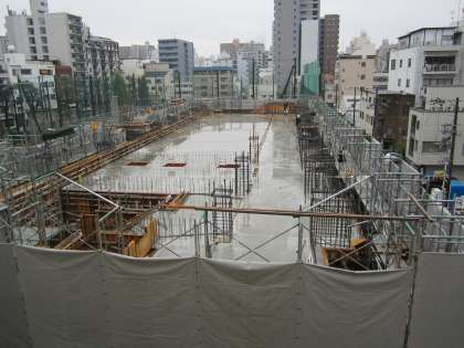 11月に入り2階の天井と3階の床の基礎を作りました。土曜日の1日でコンクリートミキサー車50数台分をクレーンと巨大なチューブで流し込んでいます。