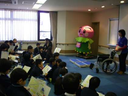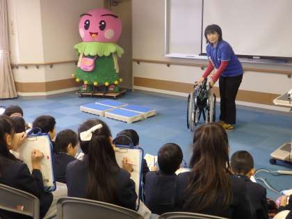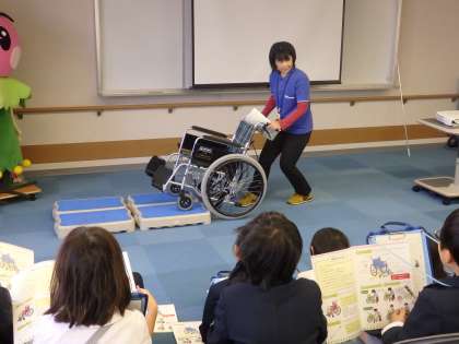 次は『車いす』について、実際に車いすを見たり、わかりやすい手引きを見たりしながら学習しました。車いすの構造を知った後は、段差がある時の押し方や車いすの折りたたみ方についても教えていただきました。