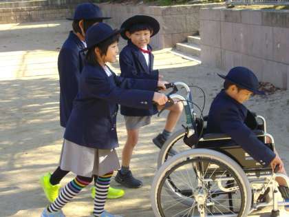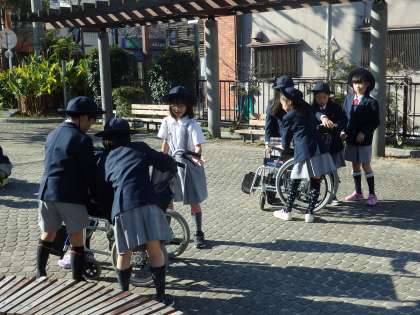 最後は、実際に車いすに乗ったり押したりする体験をしました。これまでに車いすを押したことのある児童は、どのクラスも10人弱だったので、ほとんどの児童が初めての体験でした。スタート地点では、ドキドキ緊張しているようでしたが、慣れてくると笑顔も見られました。
