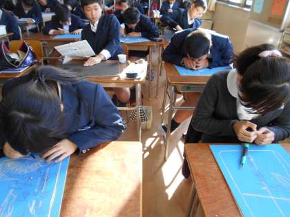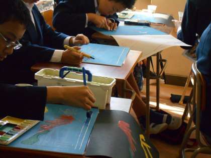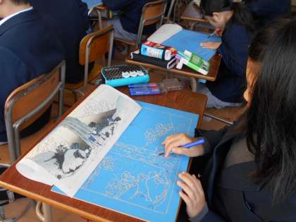 歴史で学習した江戸時代の浮世絵を題材に、多色刷り版画に挑戦しています。