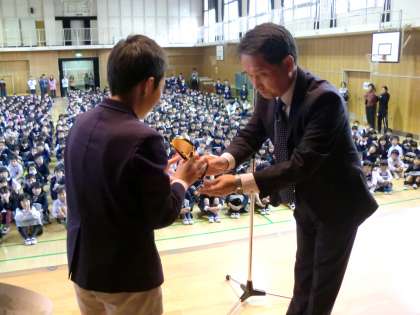 また、中央小サッカークラブが昨日の大会で第3位となり、その表彰式も行いました。