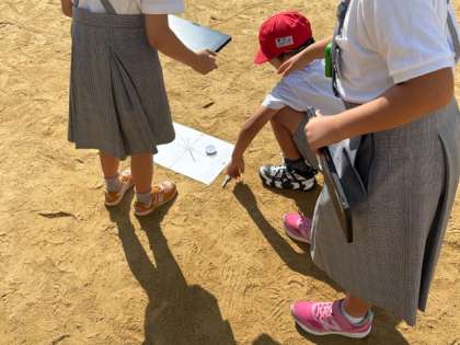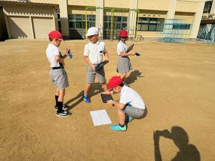 3年生は「かげと太陽の動き」の学習で、時刻による日陰の変化を観察しました。