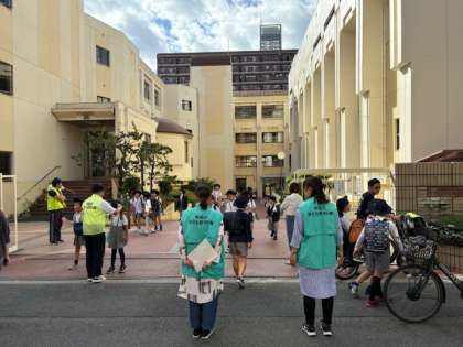 PTA、地域の方々、教職員が危険なポイントに立ち、子どもたちに「さようなら。」「気をつけてね。」など声をかけています。