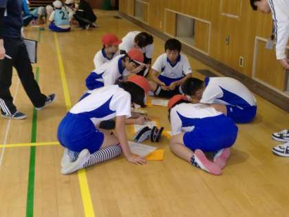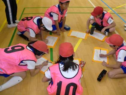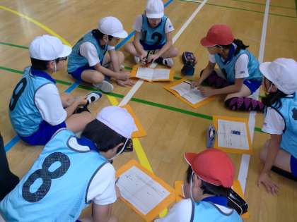体育でバスケットボールをしています。班ごとに作戦を立てて、ゲームをしています。