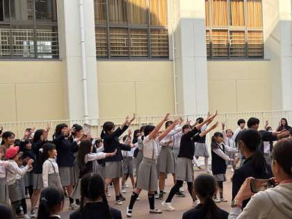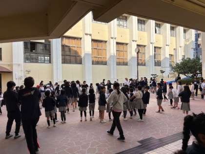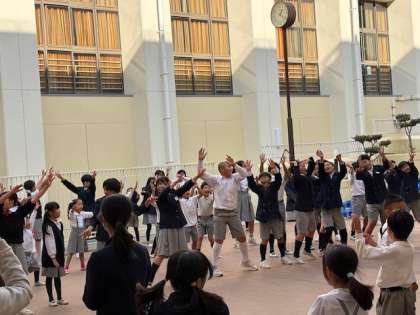 ピロティで児童会の子たちが創立をお祝いするダンスを披露しました。