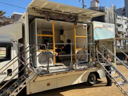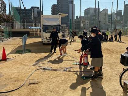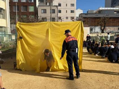 起震車や水消火器、煙テントなどを体験したり、簡易担架の作り方や応急処置の仕方なども教わったりしました。