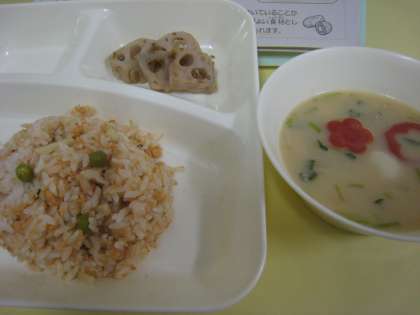今日のメニューは「さけちらし、ぞう煮、れんこんのごまじょうゆ焼き、牛乳」でした。