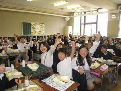 子どもたちは、学校で新年早々に友達と一緒に食べるお正月の行事献立にニコニコ笑顔でした。