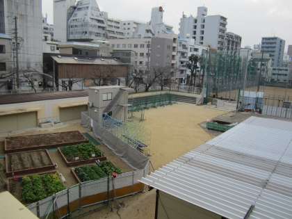 また、運動場の地下に雨水貯留槽を作るため、学習園と体育倉庫を残し、運動場の全体がフェンスで囲われています。3学期から運動場を使用できなくなり25分休けいと体育の時間はグランドを使っています。