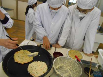 韓国の料理、チヂミを作りました。今までに食べたことのある子が多く、韓国料理としてよく知られているようです。