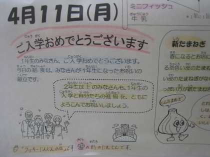 今年度の給食スタート『入学お祝い献立』(4/11の給食)