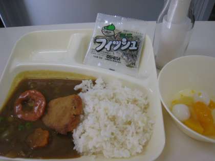 今日のメニューは「カツカレーライス(年1回)、フルーツ白玉(年1回)、ミニフィッシュ、牛乳」でした。