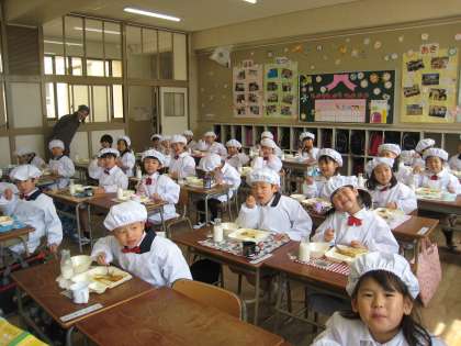 新しい給食室で作った給食を、新しい学年・学級で初めていただきました。給食を取りに来た当番児童は、新しいピカピカの給食室に驚いていました。(新しい給食室の紹介は後日いたします)