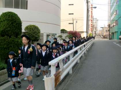 1年生は、新しく大きなランドセルを背負い、がんばって登校しています。