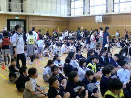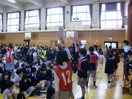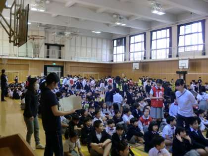 講堂では、たてわり班(異学年)に分かれて集まり集会に参加します。
