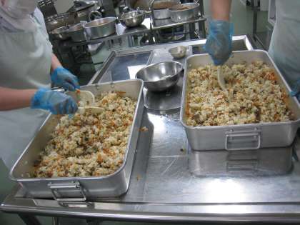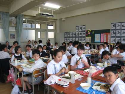 今日のメニューは「牛肉のちらしずし、すまし汁、ちまき、牛乳」でした。「牛肉のちらしずし」は牛肉、たけのこ、にんじん、グリンピースをよりうま味が増すように昆布(粉末)も使って味付けしました。これらの彩のよい具材とたきたてのごはんを合わせ、きざみのりをかけていただきました。中央小は23クラスもありますが、クラス毎に混ぜ合わせているので、(2枚目の写真)フワッとしたちらしずしに仕上がります。「ちまき」は米の粉で作ったもちを笹の葉で巻いたものを蒸しました。ちまきには、子どもたちが元気で大きくなりますようにという願いがこめられています。