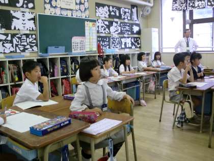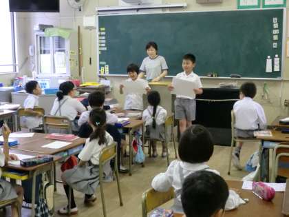 ゴールデンウィークの思い出作文を発表しています。発表後に、友だちの文章の良いところを伝え、学習をより深めています。