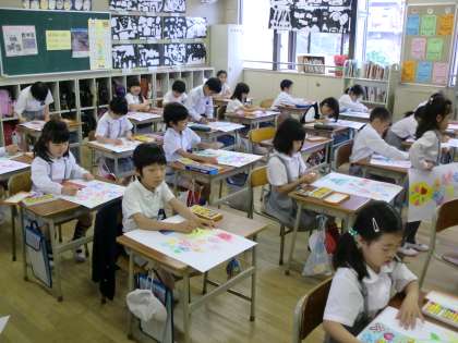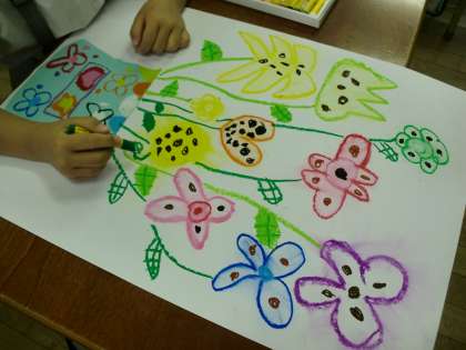 花の絵を描いています。みんな好きな色を使い、鮮やかな花がいっぱい咲きました。