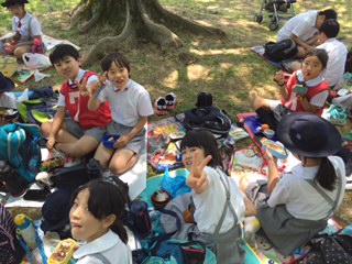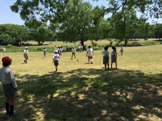 昼からはお弁当を食べ、5年生みんなで遊びました。広い芝生で、みんな元気に走り回りました。少し暑いくらいの天気でしたが、みんな夢中で遊んでいました。