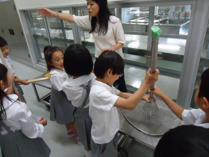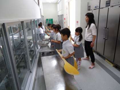 栄養教諭の浅利先生に中央小学校の給食についてお話していただき、調理中の給食室を見学しました。